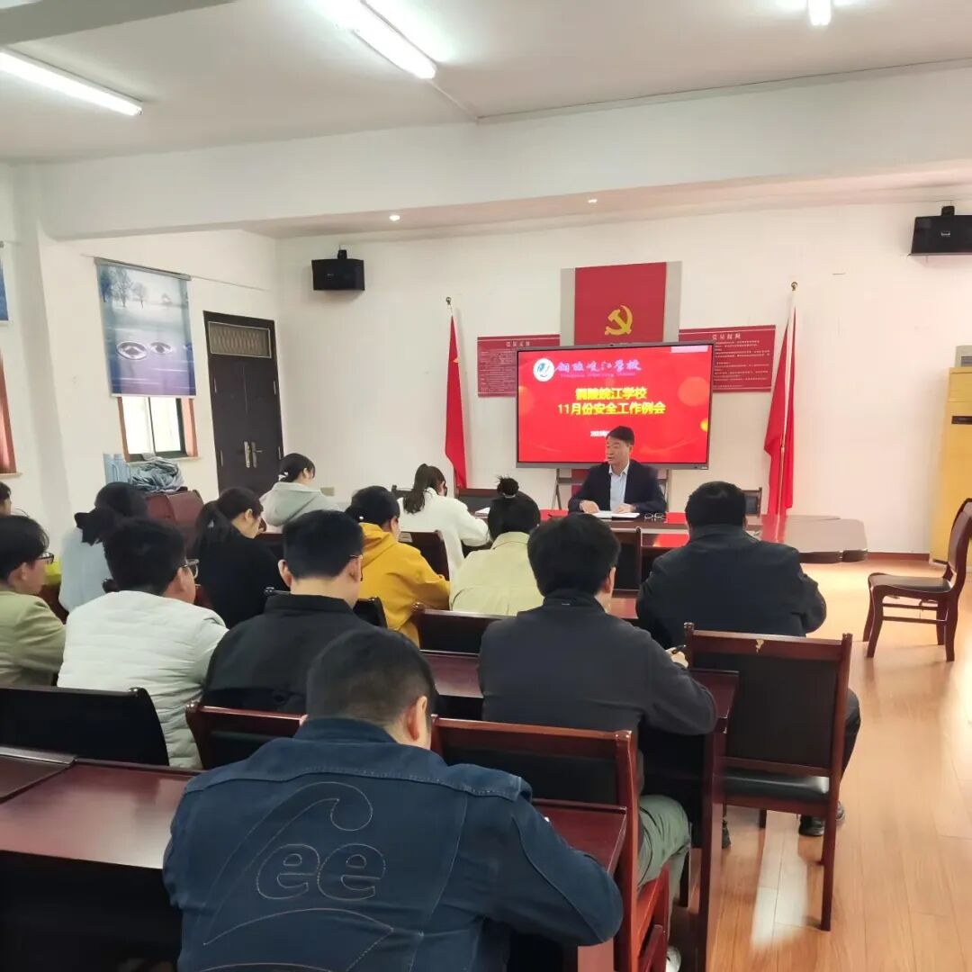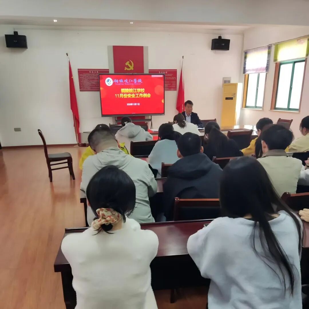 2025年11月11日,铜陵皖江学校在行政楼二楼会议室召开11月份学校安全工作例会,全体班主任和政教处工作人员参加,共同为校园安全出谋划策,为师生安全保驾护航。