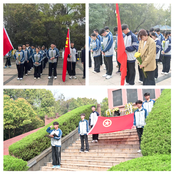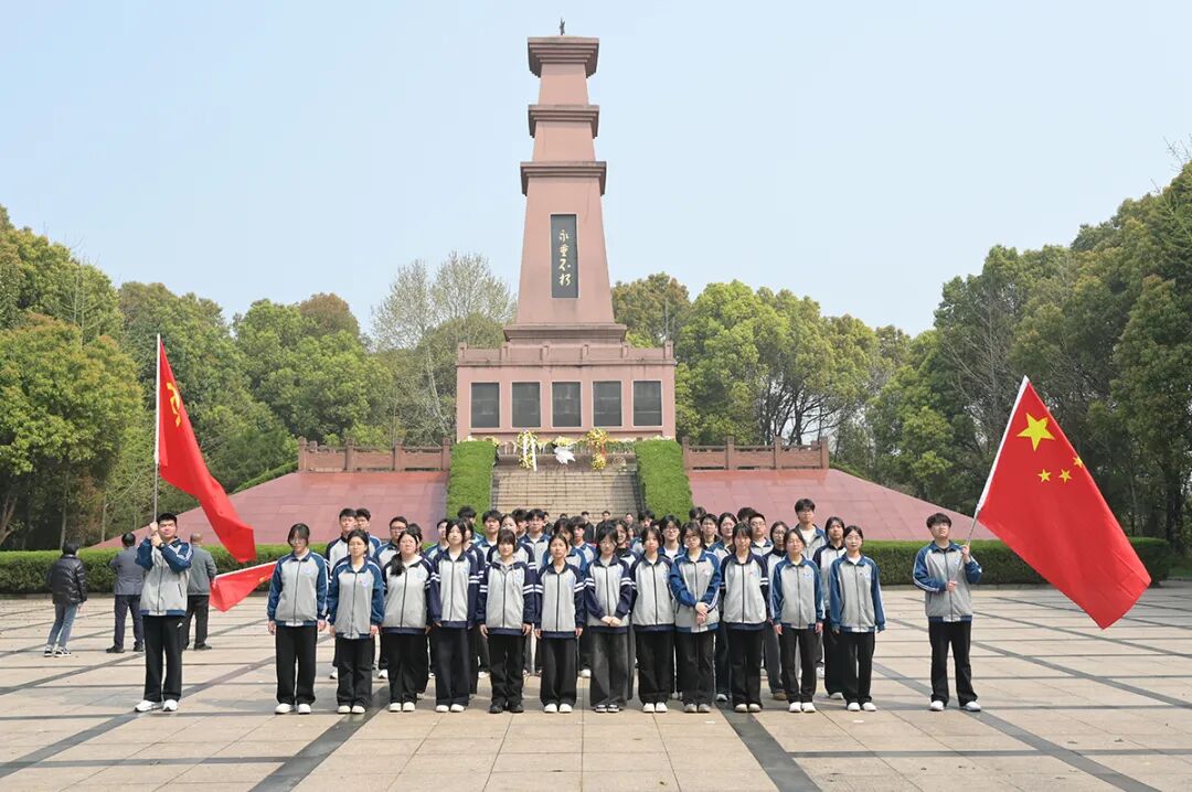 在巍峨的烈士纪念碑前,全体师生肃立默哀,向长眠于此的革命先烈敬献花篮。党员教师代表缓步上前整理缎带,团员学生依次献上菊花,以最朴素的方式表达对先烈的深切缅怀。面对鲜红的党旗和团旗,党员教师重温入党誓词,团员学生高举右拳庄严宣誓:“继承先烈遗志,勇担时代使命!”铿锵誓言回荡在陵园上空,彰显着新时代青年传承红色基因的坚定信念。